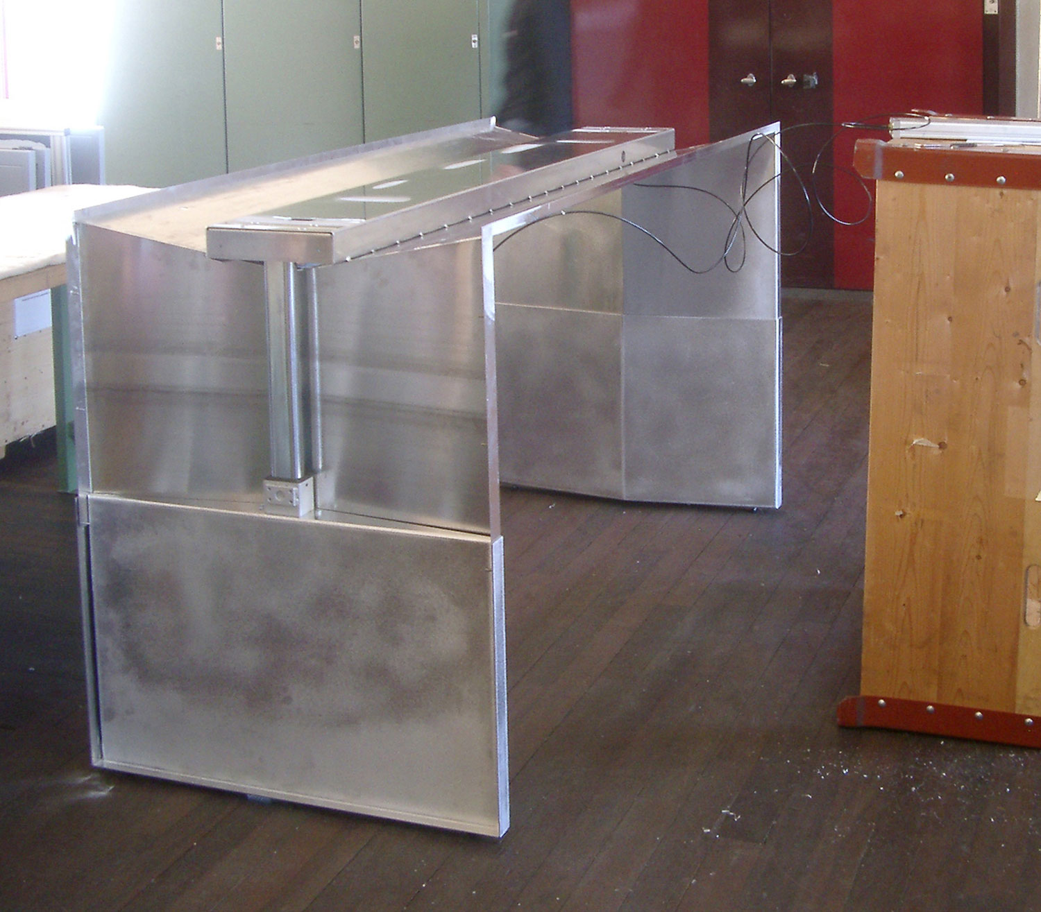 Liftable Das Auf und Ab in der Bürowelt. Der stufenlos höhenverstellbare Arbeitstisch ist eine Eigenentwicklung. Die tragende Aluminium-Blech-Konstruktion verkleidet die Hebehydraulik und den Antrieb. Der Prototyp bewährt sich in unserem Atelier seit 10 Jahren im Alltag.
